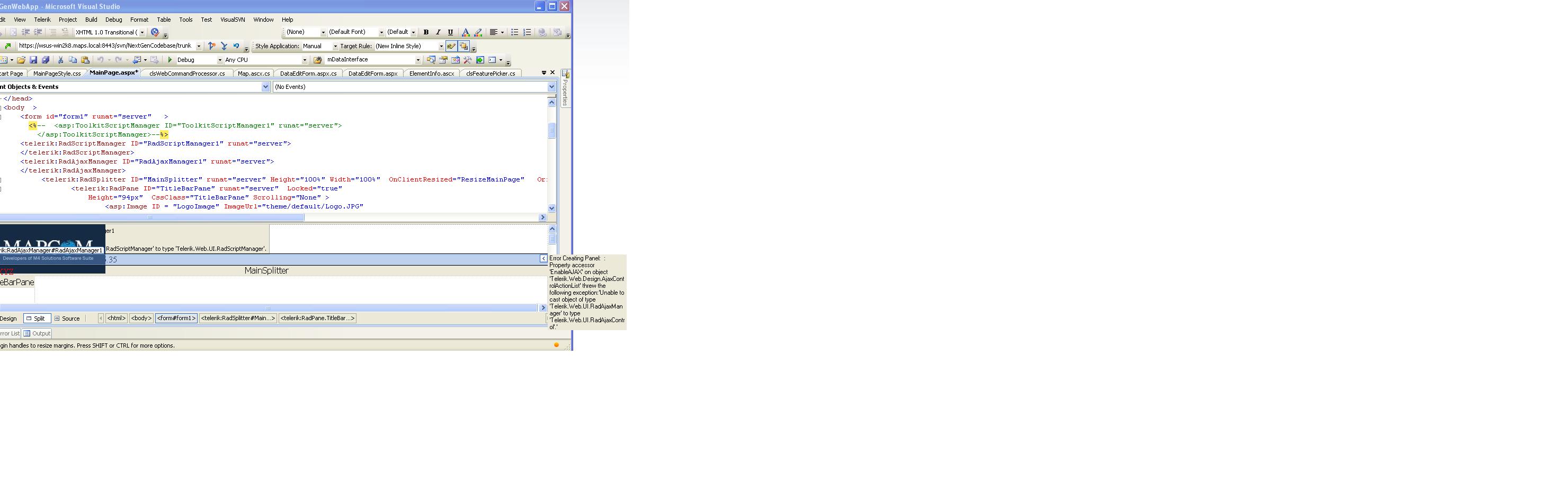 I successfully tested my app using an update panel and a css file setting its width and height to 100%. With Ajax manager I donot know the client ID for each dynamic update panel wrapping my map. If I could know the Client ID generated by RadAjax Manager, I can use css to set the dynamic updatePanels width and height to 100%. Is there a way know cliend ID? I am also not able to use Visual builder for RadAjax Manager on right clicking the RadAjax manager I get error message as shown in attached file. Can you tell me why this is happening? Is Radscript manager equivalent to ajax control tool kit's ToolkitScriptManager?