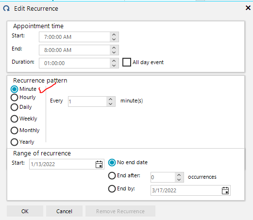 If I have correctly understood your approach, you want to add the Minutely radio button in the Recurrence Pattern section of the RecurrenceEditDialog. Such an option is not available out of the box. However, you can achieve it using custom code. In a few words, you can create custom UserControl that will represent the right part of the Recurrence Pattern section. When a RadioButton is toggled, the UserControl is changed. The UserControl needs to implement the IRecurrenceRuleSettingsControl interface. The next step is to add a new RadioButton for this UserControl. For this step, you can create a custom class that derives from EditRecurrenceDialog. The last step is to override the CreateRadioToSettingsDictionary() method to add the button and subscribe to its ToggleStateChanged event so that you can show your custom UserControl. To better demonstrate what I have in mind, I have created a sample project. Here is a snapshot of what I have implemented.