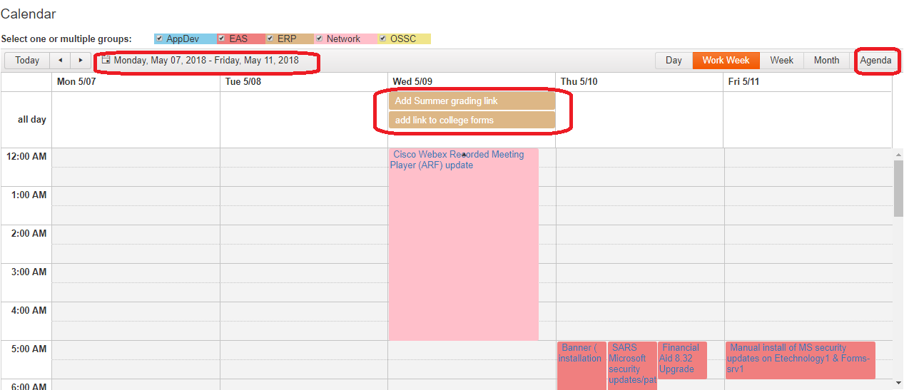 How can I set scheduler title date range to the current week (dynamic)? How to set the Agenda view to default view whenever the calendar load? How to make the text with all day schedule to hyper link (however, this text is linkable in agenda view)?
