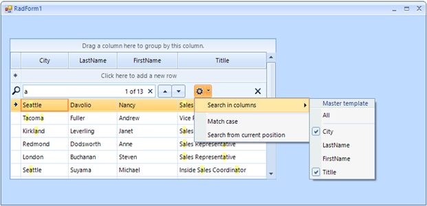 You can specify whether the search functionality is enabled for a given column by setting the column's AllowSearching property to false as shown below:
