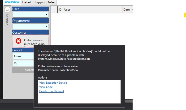 With this style applied, I get this error in my XAML files (see attached file): The element "[RadMultiColumnComboBox]" could not be displayed because of a problem with System.Windows.StaticResourceExtension: CollectionView must have value. Parameter name: collectionView.