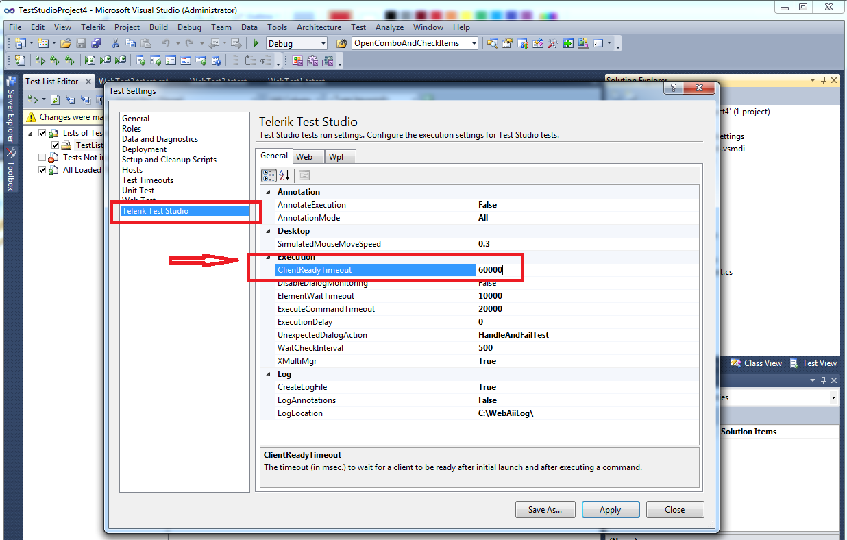 If you are running your test from Quick Execution, check the first screenshot to see where to find the "Client (Frame/Window) ready timeout" settings. If you are running your test as part of a Test List, you need to increase the ClientReadyTimeout value from the Test List Settings(see screenshot).