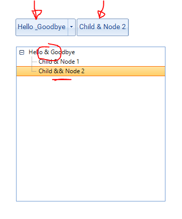this.radTreeView1.NodeFormatting += radTreeView1_NodeFormatting;this.radTreeView1.SelectedNodeChanged += radTreeView1_SelectedNodeChanged;private void radTreeView1_SelectedNodeChanged(object sender, Telerik.WinControls.UI.RadTreeViewEventArgs e){ foreach (RadSplitButtonElement item in this.radBreadCrumb1.BreadCrumbElement.Items) { item.ActionButton.TextElement.UseMnemonic = false; }} private void radTreeView1_NodeFormatting(object sender, Telerik.WinControls.UI.TreeNodeFormattingEventArgs e){ e.NodeElement.ContentElement.UseMnemonic = false; }Should you have further questions please let me know.