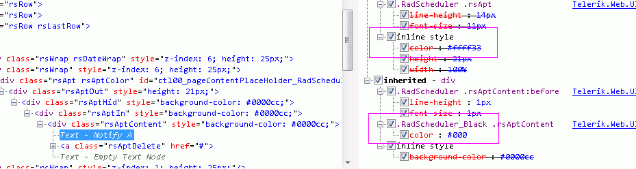 Clipboard2.gif shows the output from the IE developer tools that cearly show that the appointment's text colour is being overriden by the .rsAptContent class.