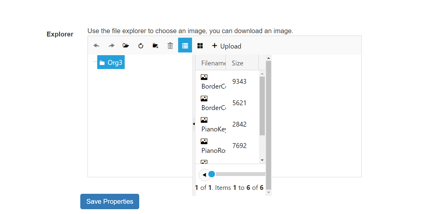 <div class="form-group" id="ExplorerDiv" runat="server" > <asp:Label runat="server" AssociatedControlID="SelectImage" CssClass="col-md-2 control-label">Explorer</asp:Label> <div class="col-md-4" > <span >Use the file explorer to choose an image, you can download an image.</span> <telerik:RadFileExplorer RenderMode="Lightweight" runat="server" ID="FileExplorer1" Width="580px" Height="300px" EnableCreateNewFolder="true" VisibleControls="Grid,TreeView,ContextMenus,Toolbar,FileList" AllowPaging="true" PageSize="8" OnClientItemSelected="OnClientItemSelected"> <Configuration EnableAsyncUpload="true" AllowMultipleSelection="true" ViewPaths = "~/Organizations/Org3" UploadPaths = "~/Organizations/Org3" DeletePaths = "~/Organizations/Org3"></Configuration> </telerik:RadFileExplorer> </div></div>