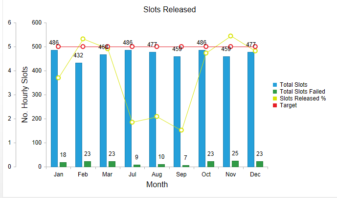 public void SetupSlotsReleasedChart(RadHtmlChart radChart){ DataTable dtDataTable = new DataTable(); ResultData oResultData = new ResultData(); InternetHomeController oController = new InternetHomeController(); // Get Tenant KPI Data for a specific Tenant KPI ID (for Homepage Graph) oResultData = oController.GetKPIGraphData(ref dtDataTable); // Set the Chart Title and Set the X Axis and Y Axis Labels radChart.ChartTitle.Text = "Slots Released"; radChart.PlotArea.XAxis.TitleAppearance.Text = "Month"; radChart.PlotArea.YAxis.TitleAppearance.Text = "No. Hourly Slots"; // The "Total Slots Value" will be the bar graph ColumnSeries totalSlotsValueColumnSeries = new ColumnSeries(); // The "Total Slots Failed Value" will be the bar graph ColumnSeries totalSlotsFailedValueColumnSeries = new ColumnSeries(); // Add and additional Y axis to be used for the Slots Released Percentageand Slots Released Target value series AxisY axisY = new AxisY(); axisY.Name = "Percentage_Axis"; radChart.PlotArea.AdditionalYAxes.Add(axisY); // The "Slots Released Percentage Value" will be a line graph LineSeries slotsValueLineSeries = new LineSeries(); // This series will use the additional Y axis created above slotsValueLineSeries.AxisName = "Percentage_Axis"; // The "Slots Released Target Value" will be a line graph LineSeries slotsTargetValueLineSeries = new LineSeries(); // This series will use the additional Y axis created above slotsTargetValueLineSeries.AxisName = "Percentage_Axis"; // Do not show the number values on the line graphs slotsValueLineSeries.LabelsAppearance.Visible = false; slotsTargetValueLineSeries.LabelsAppearance.Visible = false; // Display Legend on graph for the Value and Target series slotsValueLineSeries.Name = "Slots Released %"; slotsTargetValueLineSeries.Name = "Target"; // Display Legend on graph for the Total Slots and Total Slots Failed values (bar chart) totalSlotsValueColumnSeries.Name = "Total Slots"; totalSlotsFailedValueColumnSeries.Name = "Total Slots Failed"; foreach (DataRow row in dtDataTable.Rows) { // Populate the Total Slots Value bar graph series totalSlotsValueColumnSeries.SeriesItems.Add(Decimal.Parse(row["SRTotalSlotsValue"].ToString())); // Populate the Total Slots Failed Value bar graph series totalSlotsFailedValueColumnSeries.SeriesItems.Add(Decimal.Parse(row["SRTotalSlotsFailedValue"].ToString())); // Populate the Slots Released Percentage Value line graph series slotsValueLineSeries.SeriesItems.Add(Decimal.Parse(row["SRValue"].ToString())); // Populate the Slots Released Target line graph series slotsTargetValueLineSeries.SeriesItems.Add(Int32.Parse(row["SRTargetValue"].ToString())); // Set the labels on the X Axis AxisItem xAxisItem = new AxisItem(row["MonthDesc"].ToString()); radChart.PlotArea.XAxis.Items.Add(xAxisItem); } // Add the Total Slots Value bar graph to the plot area radChart.PlotArea.Series.Add(totalSlotsValueColumnSeries); // Add the Total Slots Failed Value bar graph to the plot area radChart.PlotArea.Series.Add(totalSlotsFailedValueColumnSeries); // Add the Slots Released Percentage Value line graph to the plot area radChart.PlotArea.Series.Add(slotsValueLineSeries); // Add the Delay in Communication Target line graph series to the plot area radChart.PlotArea.Series.Add(slotsTargetValueLineSeries);}