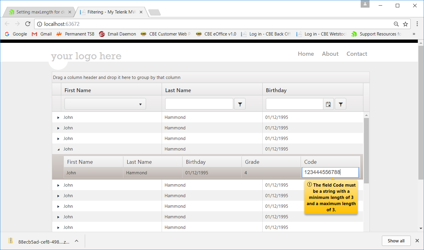 I have a page that contains a parent grid and a child details grid. The parent grid uses popup editing and I can control the maxLength of the edit fields on the dialog. However, the child details grid allows inline editing and one of the fields ("Code") can only be a length of 3 digits.