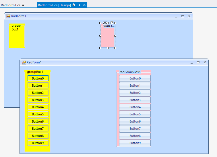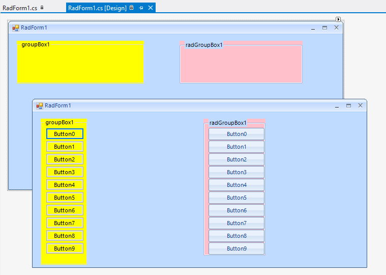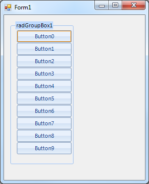 public Form1(){ InitializeComponent(); this.radGroupBox1.AutoSize = true; for (int i = 0; i < 10; i++) { RadButton btn = new RadButton(); btn.Text = "Button" + i; btn.Location = new Point(radGroupBox1.Location.X, radGroupBox1.Location.Y + i * 25 + 5); this.radGroupBox1.Controls.Add(btn); }}I hope this information helps. Should you have further questions, I would be glad to help.
