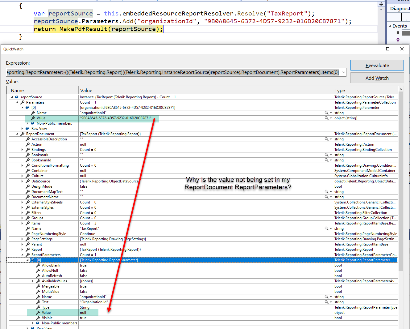 I assume you are using a ReportProcessor instance to render the report in PDF format, but from the provided screenshot it is not clear when and how the report rendering happens. I can only see that the parameter in the report definition corresponds by name and value type to the parameters in ReportSource collection. You could inspect the RenderingResult.Errors array and check the inner exception details - it can give some clue what's wrong.
