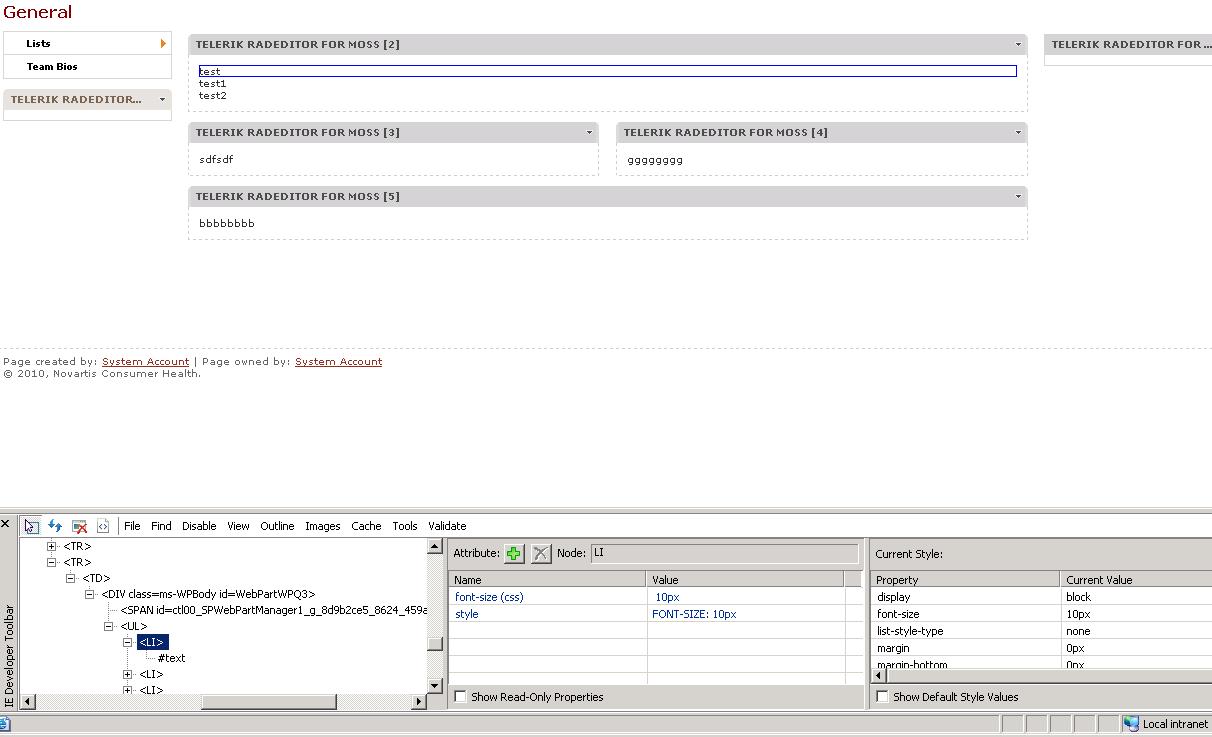 <root> <modules> <module name="RadEditorDomInspector" /> </modules> <tools name="MossTools1"> <tool name="AjaxSpellCheck" /> <tool name="FindAndReplace" /> <tool separator="true" /> <tool name="Cut" shortcut="CTRL+X" /> <tool name="Copy" shortcut="CTRL+C" /> <tool name="Paste" shortcut="CTRL+V" /> <tool separator="true" /> <tool name="Undo" shortcut="CTRL+Z" /> <tool name="Redo" shortcut="CTRL+Y" /> <tool separator="true" /> <tool name="MOSSLinkManager" shortcut="CTRL+K" /> <tool name="Unlink" shortcut="CTRL+SHIFT+K" /> <tool name="ImageManager" shortcut="CTRL+G" /> <tool name="MOSSTemplateManager" /> <tool separator="true" /> <tool name="MOSSInsertTable" /> <tool name="SetTableProperties" /> <tool name="ToggleTableBorder" /> <tool separator="true" /> <tool name="MOSSInsertTableElement"> <tool name="InsertRowAbove" /> <tool name="InsertRowBelow" /> <tool name="InsertColumnLeft" /> <tool name="InsertColumnRight" /> <tool name="DeleteRow" /> <tool name="DeleteColumn" /> <tool name="SplitCell" /> </tool> <tool name="MergeColumns" /> <tool separator="true" /> <tool name="ToggleSource" /> <tool name="FormatStripper" /> <tool separator="true" /> <tool name="MOSSRightToLeft" /> <tool name="MOSSLeftToRight" /> <tool separator="true" /> <tool name="ForeColor" /> <tool name="BackColor" /> </tools> <tools name="MossTools2"> <tool name="ApplyClass" /> <tool name="FormatBlock" /> <tool separator="true" /> <tool name="FontName" /> <tool name="FontSize" /> <tool separator="true" /> <tool name="Bold" shortcut="CTRL+B" /> <tool name="Italic" shortcut="CTRL+I" /> <tool name="Underline" shortcut="CTRL+U" /> <tool separator="true" /> <tool name="JustifyLeft" /> <tool name="JustifyCenter" /> <tool name="JustifyRight" /> <tool separator="true" /> <tool name="InsertOrderedList" /> <tool name="InsertUnorderedList" /> <tool separator="true" /> <tool name="Indent" /> <tool name="Outdent" /> </tools> <fontSizes> <item>1</item> <item>5</item> <item>7</item> </fontSizes> <fontNames> <item name="Arial" /> <item name="Arial Narrow" /> <item name="Arial Black" /> </fontNames> <contextMenus> <contextMenu forElement="*"> <tool name="Cut"/> <tool name="Copy"/> <tool name="Paste"/> </contextMenu> </contextMenus></root>Regards,