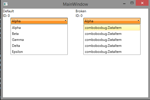 If the Template property of a RadComboBoxItem is set, then the DisplayMemberPath property of the RadComboBox will no longer display on each item in the drop down. The currently selected item will still appear correctly.