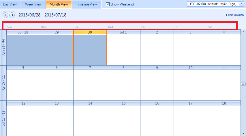 I am not able to set the weekday format in Scheduler for month view. I am using the control in a very small area, and I need to set the weekday names to be abbreviated (Mon, Tue, Wed, etc.).