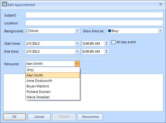 The control that fits your requirements best is the RadScheduler control. It allows you to create and manage appointments and also assign a resource to each appointment. The default dialog allows you to assign a single resource to an appointment as shown in the attached screenshot. In case you would like to assign multiple resources to an appointment, there is a Knowledge Base article which demonstrates how to do this.
