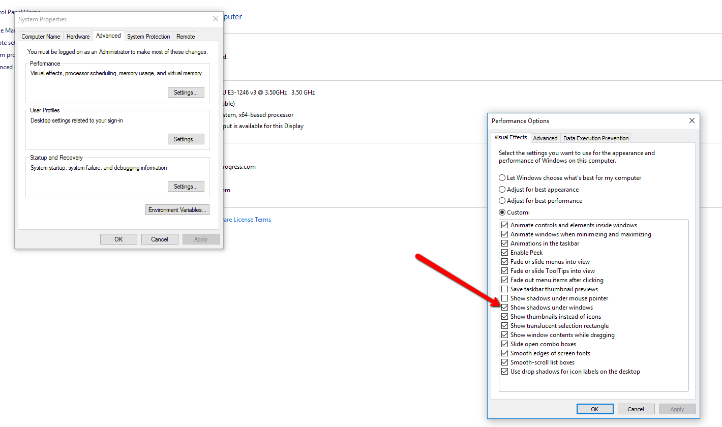 Do any other windows have shadows? This is controlled in the Windows settings as well - see attached image.