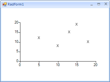 public RadForm1(){ InitializeComponent(); ScatterSeries scatterSeries = new ScatterSeries(); scatterSeries.Shape = new CrossShape(); scatterSeries.PointSize = new SizeF(15, 15); scatterSeries.DataPoints.Add(new ScatterDataPoint(15, 19)); scatterSeries.DataPoints.Add(new ScatterDataPoint(18, 10)); scatterSeries.DataPoints.Add(new ScatterDataPoint(13, 15)); scatterSeries.DataPoints.Add(new ScatterDataPoint(10, 8)); scatterSeries.DataPoints.Add(new ScatterDataPoint(5, 12)); this.radChartView1.Series.Add(scatterSeries);}public class CrossShape : ElementShape{ public CrossShape() { this.Width = 1; } public override GraphicsPath CreatePath(Rectangle bounds) { GraphicsPath path = new GraphicsPath(); path.AddString("X", new FontFamily("Arial"), 1, 12f, new Point(bounds.X, bounds.Y), StringFormat.GenericDefault); return path; } public int Width { get; set; }}I hope this information helps.