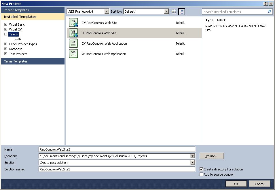 I was wondering if someone could give advice on how to best share development of a 'VB RadControls Web Site'. That is the option I selected when I selected a new project in VS2010, within the Telerik template group (see attachment). I want to share development between two people both running VS2010, publishing to the same IIS7 web server. We have two sites on that server, a test site on port 8001 and a live site will eventually run https on different port.