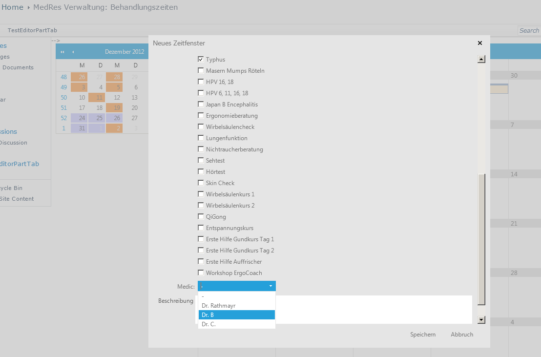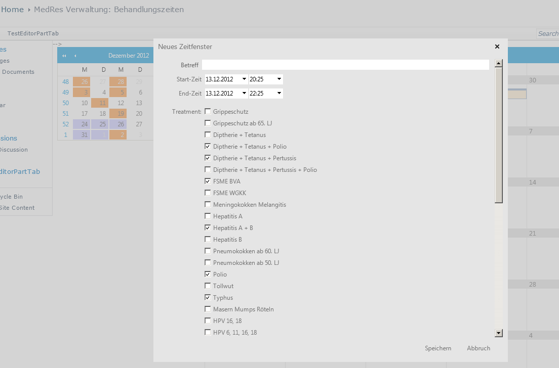 using System;using System.Globalization;using Microsoft.SharePoint;using Microsoft.SharePoint.WebControls;using System.Collections.Generic;using System.Web.UI;using System.Web.UI.WebControls;using System.Data;using Telerik.Web.UI;namespace ShareVision.SharePoint2010.MedResWebParts.Layouts.MedResWebParts{ /// <summary> /// <para> /// MedRes Verwaltung durch Admin - TimeFrames. /// </para> /// <para> /// Ermöglicht das Erstellen von Einmal- und Serienterminen (=Behandlungen) durch den Arzt. /// </para> /// </summary> public partial class MgmtTimeFrame : LayoutsPageBase { /// <summary> /// Für 1:n Beziehungen kann der Telerik Scheduler keine automatische Datenbindung. /// Vielmehr muss man hierzu einen eigenen FactoryProvider erstellen welcher diese 1:n Zuordnung pflegt (insert/delete). /// </summary> private MedResSchedulerProvider provider; protected void Page_Init(object sender, EventArgs e) { //EnsureChildControls(); provider = new MedResSchedulerProvider(); provider.ConnectionString = System.Configuration.ConfigurationManager.ConnectionStrings["MedResConnectionString"].ConnectionString; this.RadScheduler1.Provider = provider; System.Threading.Thread.CurrentThread.CurrentCulture = new CultureInfo("de-DE"); } private ScriptManager CheckScriptManager() { Page.ClientScript.RegisterStartupScript(typeof(MgmtTimeFrame), this.ID, "_spOriginalFormAction = document.forms[0].action;_spSuppressFormOnSubmitWrapper=true;", true); if (this.Page.Form != null) { string formOnSubmitAtt = this.Page.Form.Attributes["onsubmit"]; if (!string.IsNullOrEmpty(formOnSubmitAtt) && formOnSubmitAtt == "return _spFormOnSubmitWrapper();") { this.Page.Form.Attributes["onsubmit"] = "_spFormOnSubmitWrapper();"; } } ScriptManager scriptManager = ScriptManager.GetCurrent(Page); if (scriptManager == null) { if (Page.Form != null) { scriptManager = new ScriptManager(); scriptManager.ID = Page.Form.ID + "_ScriptManager"; Page.Form.Controls.Add(scriptManager); } } if (scriptManager != null) { string telerikAssembly = typeof(RadScheduler).Assembly.FullName; scriptManager.Scripts.Add(new ScriptReference("Telerik.Web.UI.Common.Core.js", telerikAssembly)); scriptManager.Scripts.Add(new ScriptReference("Telerik.Web.UI.Common.jQuery.js", telerikAssembly)); scriptManager.Scripts.Add(new ScriptReference("Telerik.Web.UI.Common.jQueryPlugins.js", telerikAssembly)); scriptManager.Scripts.Add(new ScriptReference("Telerik.Web.UI.Common.Popup.PopupScripts.js", telerikAssembly)); scriptManager.Scripts.Add(new ScriptReference("Telerik.Web.UI.Common.Navigation.NavigationScripts.js", telerikAssembly)); scriptManager.Scripts.Add(new ScriptReference("Telerik.Web.UI.Menu.RadMenuScripts.js", telerikAssembly)); scriptManager.Scripts.Add(new ScriptReference("Telerik.Web.UI.Menu.ContextMenu.RadContextMenuScripts.js", telerikAssembly)); scriptManager.Scripts.Add(new ScriptReference("Telerik.Web.UI.Input.TextBox.RadInputScript.js", telerikAssembly)); scriptManager.Scripts.Add(new ScriptReference("Telerik.Web.UI.Input.DateInput.RadDateInputScript.js", telerikAssembly)); scriptManager.Scripts.Add(new ScriptReference("Telerik.Web.UI.Input.NumericTextBox.RadNumericInputScript.js", telerikAssembly)); scriptManager.Scripts.Add(new ScriptReference("Telerik.Web.UI.Calendar.RadTimeViewScripts.js", telerikAssembly)); scriptManager.Scripts.Add(new ScriptReference("Telerik.Web.UI.Calendar.RadCalendarCommonScript.js", telerikAssembly)); scriptManager.Scripts.Add(new ScriptReference("Telerik.Web.UI.Calendar.RadCalendarScript.js", telerikAssembly)); scriptManager.Scripts.Add(new ScriptReference("Telerik.Web.UI.Calendar.RadDatePicker.js", telerikAssembly)); scriptManager.Scripts.Add(new ScriptReference("Telerik.Web.UI.Calendar.RadDateTimePickerScript.js", telerikAssembly)); scriptManager.Scripts.Add(new ScriptReference("Telerik.Web.UI.ComboBox.RadComboBoxScripts.js", telerikAssembly)); scriptManager.Scripts.Add(new ScriptReference("Telerik.Web.UI.Scheduler.Helpers.DateTime.js", telerikAssembly)); scriptManager.Scripts.Add(new ScriptReference("Telerik.Web.UI.Scheduler.RadSchedulerScripts.js", telerikAssembly)); scriptManager.Scripts.Add(new ScriptReference("Telerik.Web.UI.Scheduler.RecurrenceEditor.RecurrenceEditor.js", telerikAssembly)); scriptManager.Scripts.Add(new ScriptReference("Telerik.Web.UI.Scheduler.Views.Week.Model.js", telerikAssembly)); scriptManager.Scripts.Add(new ScriptReference("Telerik.Web.UI.Scheduler.Views.Week.GroupedByResource.Model.js", telerikAssembly)); scriptManager.Scripts.Add(new ScriptReference("Telerik.Web.UI.Scheduler.Views.Week.GroupedByDate.Model.js", telerikAssembly)); scriptManager.Scripts.Add(new ScriptReference("Telerik.Web.UI.Scheduler.Views.MultiDay.Model.js", telerikAssembly)); scriptManager.Scripts.Add(new ScriptReference("Telerik.Web.UI.Scheduler.Views.MultiDay.GroupedByResource.Model.js", telerikAssembly)); scriptManager.Scripts.Add(new ScriptReference("Telerik.Web.UI.Scheduler.Views.MultiDay.GroupedByResource.Model.js", telerikAssembly)); scriptManager.Scripts.Add(new ScriptReference("Telerik.Web.UI.Scheduler.Views.Day.Model.js", telerikAssembly)); scriptManager.Scripts.Add(new ScriptReference("Telerik.Web.UI.Scheduler.Views.Day.GroupedByResource.Model.js", telerikAssembly)); scriptManager.Scripts.Add(new ScriptReference("Telerik.Web.UI.Scheduler.Views.Month.Model.js", telerikAssembly)); scriptManager.Scripts.Add(new ScriptReference("Telerik.Web.UI.Scheduler.Views.Month.GroupedByResource.Model.js", telerikAssembly)); scriptManager.Scripts.Add(new ScriptReference("Telerik.Web.UI.Scheduler.Views.Month.GroupedByDate.Model.js", telerikAssembly)); scriptManager.Scripts.Add(new ScriptReference("Telerik.Web.UI.Scheduler.Views.Timeline.Model.js", telerikAssembly)); scriptManager.Scripts.Add(new ScriptReference("Telerik.Web.UI.Scheduler.Views.Timeline.GroupedByResource.Model.js", telerikAssembly)); scriptManager.Scripts.Add(new ScriptReference("Telerik.Web.UI.Scheduler.Views.Timeline.GroupedByDate.Model.js", telerikAssembly)); scrip