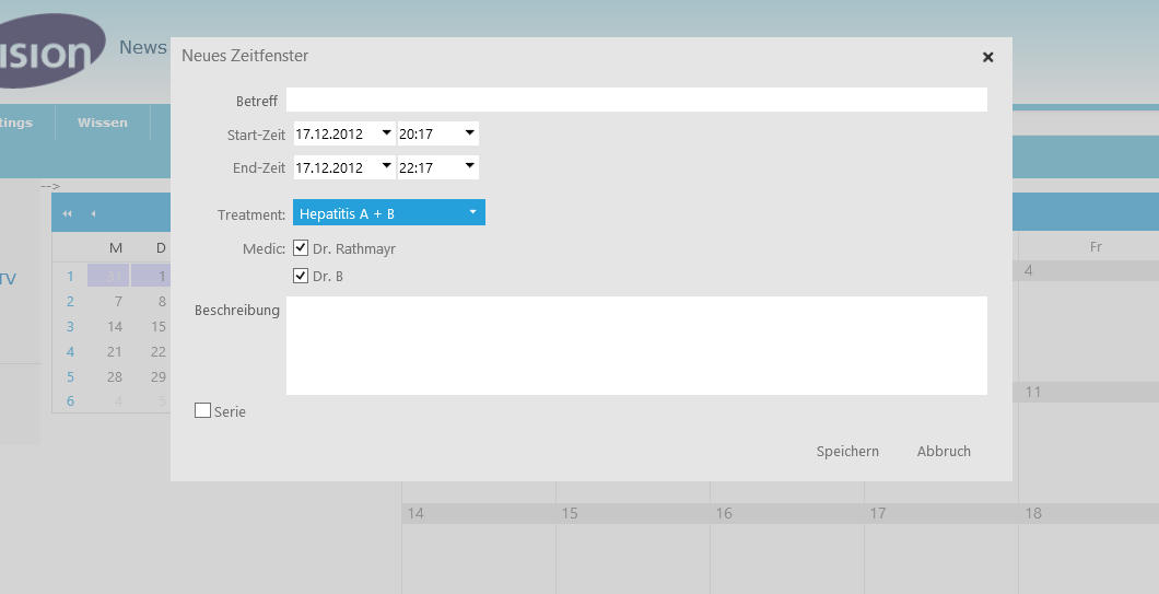 <telerik:RadScheduler ID="RadScheduler1" runat="server" SelectedView="MonthView" Culture="de-DE" FirstDayOfWeek="Monday" Height="800px" Width="100%" HoursPanelTimeFormat="H:mm" MinutesPerRow="5" TimeLabelRowSpan="3" TimeZoneID="W. Europe Standard Time" TimeZoneOffset="01:00:00" OverflowBehavior="Expand" ColumnWidth="17%" WorkDayStartTime="09:00:00" WeekDayEndTime="18:00:00" DataEndField="DtmEnd" DataKeyField="ID" DataStartField="DtmStart" DataSubjectField="Name" DataDescriptionField="Description" DataRecurrenceField="RecRule" DataRecurrenceParentKeyField="ID" OnClientAppointmentInserting="OnClientAppointmentInserting" Skin="Metro" AppointmentStyleMode="Default" OnAppointmentDataBound="RadScheduler1_AppointmentDataBound" OnAppointmentCreated="RadScheduler1_AppointmentCreated" EnableDescriptionField="True" OnFormCreated="RadScheduler1_FormCreated" EnableExactTimeRendering="True" DisplayRecurrenceActionDialogOnMove="True" WorkDayEndTime="18:00:00" ShowNavigationPane="false" OnTimeSlotCreated="RadScheduler1_TimeSlotCreated" OnAppointmentCommand="RadScheduler1_AppointmentCommand" WeekView-UserSelectable="False" DayView-UserSelectable="False" MonthView-UserSelectable="False"> <AdvancedForm Modal="true" Enabled="true" EnableResourceEditing="true" EnableCustomAttributeEditing="true" /> <ResourceTypes> <telerik:ResourceType DataSourceID="SqlDataSourceMedics" ForeignKeyField="Medic" KeyField="ID" Name="Arzt" TextField="Name" /> <telerik:ResourceType DataSourceID="SqlDataSourceTreatment" ForeignKeyField="Treatment" KeyField="ID" Name="Behandlung" TextField="Description" /> </ResourceTypes> <Localization AdvancedNewAppointment="Neues Zeitfenster" AdvancedEditAppointment="Zeitfenster bearbeiten" AdvancedSubject="Betreff" AdvancedDescription="Beschreibung" AdvancedRecurrence="Serie" AdvancedRecurEvery="jeden" HeaderDay="Tag" HeaderMonth="Monat" HeaderTimeline="Zeitlinie" HeaderToday="Heute" HeaderWeek="Woche" Save="Speichern" Show24Hours="24 Stunden Ansicht" ShowBusinessHours="Arbeitszeit Ansicht" /><AppointmentTemplate> <b><%# Eval("Subject") %></b> <br /><br /> <asp:Label runat="server" ID="lblTreatments"></asp:Label> <br /><br /> <asp:Label runat="server" ID="lblMedic"></asp:Label></AppointmentTemplate></telerik:RadScheduler>and here is the code behind: