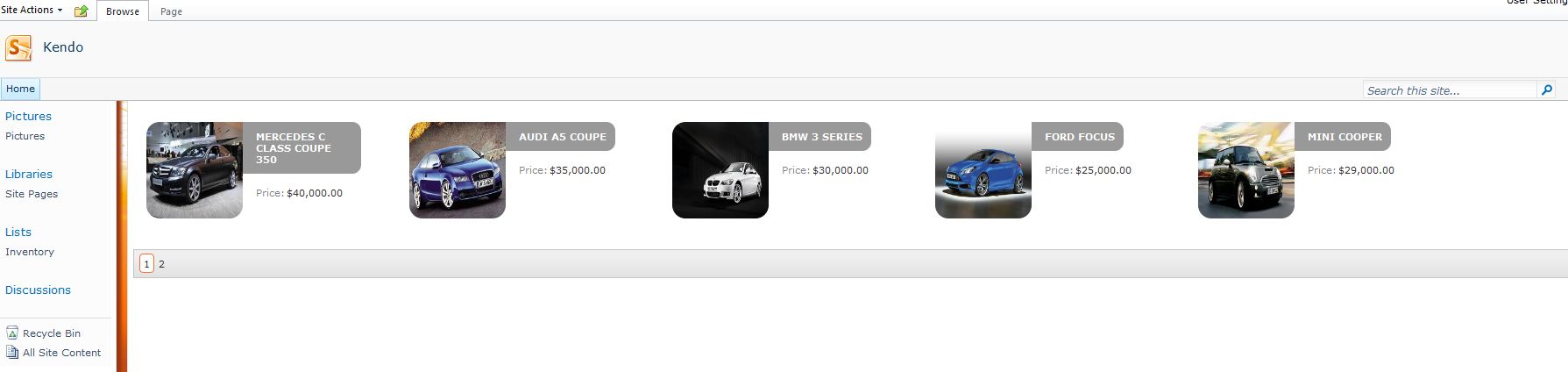 var dataSource = new kendo.data.DataSource({ type: "sharepoint", transport: { read: "_vti_bin/listdata.svc/Inventory" }, schema: { model: { fields: { Make: { type: "string" }, Model: { type: "string" }, Price: { type: "number" }, PictureUrl: { type: "string" } } } }, pageSize: 5, serverPaging: true, serverFiltering: true, serverSorting: true});I'm going to look at adding full CRUD functionality and will post any updates, this currently only does reading.