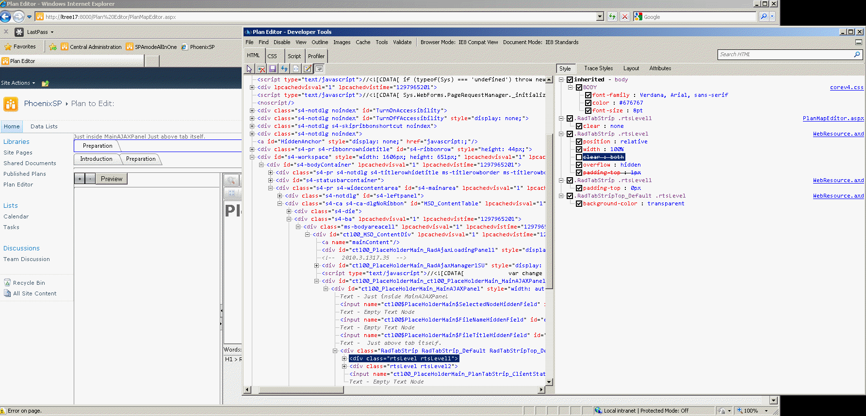 I have a RadTabStrip on a site page I've built for SharePoint. The formatting worked perfectly on SharePoint 2007, but now that I've upgraded to 2010 I have a formatting issue. The tabs are displaying below the level of the quick launch (See Figure1.png). I've used the web dev tool in IE8 and tracked it to the clear:both coming from the .RadTabStrip .rtsLevel style (See Figure2.png, notice that forcing the style in the browser causes the tabs to display properly). The style is coming from your WebResource.axd and I can't seem to make my style take priority over the one you have coming in. Is there a way in the page or in my code to manually change that one style setting?