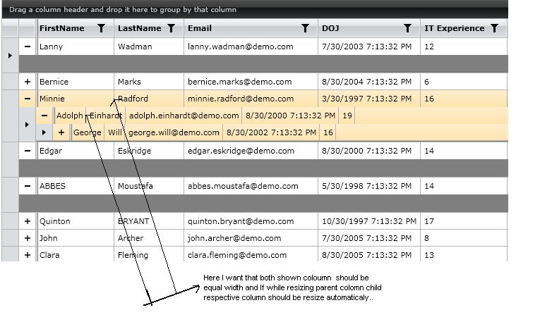 I want to show column in child Grid width is equal to parent Grid column and when I am going resizing parent column then child grid respective column should be resize automatically...