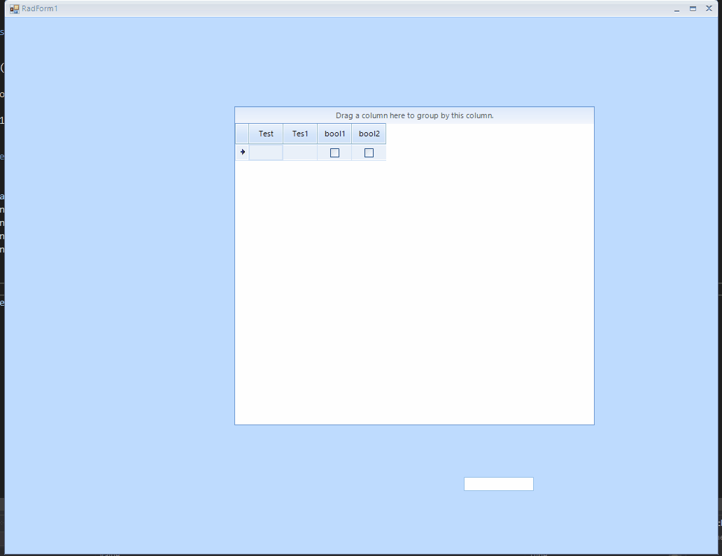 namespace _1017278{ partial class RadForm1 { /// <summary> /// Required designer variable. /// </summary> private System.ComponentModel.IContainer components = null; /// <summary> /// Clean up any resources being used. /// </summary> /// <param name="disposing">true if managed resources should be disposed; otherwise, false.</param> protected override void Dispose(bool disposing) { if (disposing && (components != null)) { components.Dispose(); } base.Dispose(disposing); } #region Windows Form Designer generated code /// <summary> /// Required method for Designer support - do not modify /// the contents of this method with the code editor. /// </summary> private void InitializeComponent() { Telerik.WinControls.UI.GridViewTextBoxColumn gridViewTextBoxColumn1 = new Telerik.WinControls.UI.GridViewTextBoxColumn(); Telerik.WinControls.UI.GridViewCheckBoxColumn gridViewCheckBoxColumn1 = new Telerik.WinControls.UI.GridViewCheckBoxColumn(); Telerik.WinControls.UI.GridViewDecimalColumn gridViewDecimalColumn1 = new Telerik.WinControls.UI.GridViewDecimalColumn(); Telerik.WinControls.UI.TableViewDefinition tableViewDefinition1 = new Telerik.WinControls.UI.TableViewDefinition(); this.radGridView1 = new Telerik.WinControls.UI.RadGridView(); this.radTextBox1 = new Telerik.WinControls.UI.RadTextBox(); this.button1 = new System.Windows.Forms.Button(); ((System.ComponentModel.ISupportInitialize)(this.radGridView1)).BeginInit(); ((System.ComponentModel.ISupportInitialize)(this.radGridView1.MasterTemplate)).BeginInit(); ((System.ComponentModel.ISupportInitialize)(this.radTextBox1)).BeginInit(); ((System.ComponentModel.ISupportInitialize)(this)).BeginInit(); this.SuspendLayout(); // // radGridView1 // this.radGridView1.Location = new System.Drawing.Point(325, 127); // // // gridViewTextBoxColumn1.HeaderText = "column1"; gridViewTextBoxColumn1.Name = "columnId"; gridViewTextBoxColumn1.Width = 100; gridViewCheckBoxColumn1.HeaderText = "column1"; gridViewCheckBoxColumn1.Name = "columnBool"; gridViewCheckBoxColumn1.Width = 66; gridViewDecimalColumn1.DataType = typeof(int); gridViewDecimalColumn1.DecimalPlaces = 0; gridViewDecimalColumn1.HeaderText = "column1"; gridViewDecimalColumn1.Name = "columnInt"; gridViewDecimalColumn1.Width = 51; this.radGridView1.MasterTemplate.Columns.AddRange(new Telerik.WinControls.UI.GridViewDataColumn[] { gridViewTextBoxColumn1, gridViewCheckBoxColumn1, gridViewDecimalColumn1}); this.radGridView1.MasterTemplate.ViewDefinition = tableViewDefinition1; this.radGridView1.Name = "radGridView1"; this.radGridView1.Size = new System.Drawing.Size(515, 456); this.radGridView1.TabIndex = 0; // // radTextBox1 // this.radTextBox1.Location = new System.Drawing.Point(653, 657); this.radTextBox1.Name = "radTextBox1"; this.radTextBox1.Size = new System.Drawing.Size(100, 20); this.radTextBox1.TabIndex = 1; // // button1 // this.button1.Location = new System.Drawing.Point(151, 42); this.button1.Name = "button1"; this.button1.Size = new System.Drawing.Size(75, 23); this.button1.TabIndex = 2; this.button1.Text = "button1"; this.button1.UseVisualStyleBackColor = true; this.button1.Click += new System.EventHandler(this.button1_Click); // // RadForm1 // this.AutoScaleDimensions = new System.Drawing.SizeF(6F, 13F); this.AutoScaleMode = System.Windows.Forms.AutoScaleMode.Font; this.ClientSize = new System.Drawing.Size(1013, 764); this.Controls.Add(this.button1); this.Controls.Add(this.radTextBox1); this.Controls.Add(this.radGridView1); this.Name = "RadForm1"; // // // this.RootElement.ApplyShapeToControl = true; this.Text = "RadForm1"; ((System.ComponentModel.ISupportInitialize)(this.radGridView1.MasterTemplate)).EndInit(); ((System.ComponentModel.ISupportInitialize)(this.radGridView1)).EndInit(); ((System.ComponentModel.ISupportInitialize)(this.radTextBox1)).EndInit(); ((System.ComponentModel.ISupportInitialize)(this)).EndInit(); this.ResumeLayout(false); this.PerformLayout(); } #endregion private Telerik.WinControls.UI.RadGridView radGridView1; private Telerik.WinControls.UI.RadTextBox radTextBox1; private System.Windows.Forms.Button button1; }}public partial class RadForm1 : Telerik.WinControls.UI.RadForm{ public RadForm1() { InitializeComponent(); radGridView1.Rows.Clear(); //radGridView1.AddNewRowPosition = Telerik.WinControls.UI.SystemRowPosition.Bottom; } private void AddRow(int i) { var rowInfo = radGridView1.Rows.AddNew(); rowInfo.Cells["columnId"].Value = Guid.NewGuid(); rowInfo.Cells["columnBool"].Value = true; rowInfo.Cells["columnInt"].Value = i + DateTime.Now.Second; } private void button1_Click(object sender, EventArgs e) { radGridView1.Rows.Clear(); for (int i = 0; i < 5; i++) { AddRow(i); } }}Thank you for the code I was able to reproduce this case. Please note that until the user clicks in the checkbox in the new row all values are null, after that the cell will have a value (true/false) and you cannot reset it to null from the UI. Once there is a value in a particular cell the row will be added to the grid. This is desired by design behavior. What you can do is use the grid events and cancel the new row adding for this exact case: