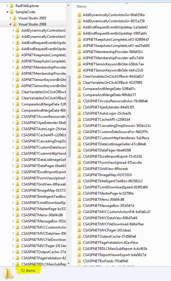 protected void Page_Load(object sender, EventArgs e) { RadFileExplorer1.Configuration.ContentProviderTypeName = typeof(CustomProvider).AssemblyQualifiedName; }public class CustomProvider : FileSystemContentProvider { public CustomProvider(HttpContext context, string[] searchPatterns, string[] viewPaths, string[] uploadPaths, string[] deletePaths, string selectedUrl, string selectedItemTag) : base(context, searchPatterns, viewPaths, uploadPaths, deletePaths, selectedUrl, selectedItemTag) { } public override DirectoryItem ResolveRootDirectoryAsTree(string path) { DirectoryItem originalDir = base.ResolveRootDirectoryAsTree(path); string physicalPath = Context.Server.MapPath(path); List<DirectoryItem> childDirItems = new List<DirectoryItem>(); foreach (DirectoryItem currentDir in originalDir.Directories) { string physicalPathChildFile = Context.Server.MapPath(currentDir.FullPath); DirectoryItem childDirItem = new DirectoryItem(currentDir.Name + "(" + Directory.GetFiles(physicalPathChildFile).Length + ")", currentDir.Location, currentDir.FullPath, currentDir.Tag, currentDir.Permissions, currentDir.Files, currentDir.Directories ); childDirItems.Add(childDirItem); } DirectoryItem dirItem = new DirectoryItem(originalDir.Name + "(" + Directory.GetFiles(physicalPath).Length + ")", originalDir.Location, originalDir.FullPath, originalDir.Tag, originalDir.Permissions, originalDir.Files, childDirItems.ToArray() ); return dirItem; } public override DirectoryItem ResolveDirectory(string path) { DirectoryItem originalDir = base.ResolveDirectory(path); string physicalPath = Context.Server.MapPath(path); DirectoryItem dirItem = new DirectoryItem(originalDir.Name + "(" + Directory.GetFiles(physicalPath).Length + ")", originalDir.Location, originalDir.FullPath, originalDir.Tag, originalDir.Permissions, originalDir.Files, originalDir.Directories ); return dirItem; } }Hope this helps.