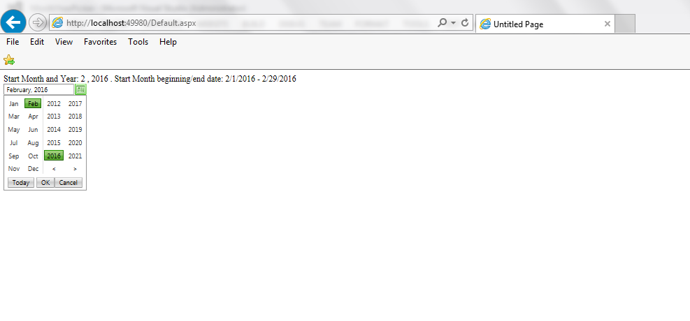 Response.Write("Start Month and Year: "+startmonth_year + ' ' + ' ' + ". Start Month beginning/end date: "+startDate.ToShortDateString() + " - " + endDate.ToShortDateString());