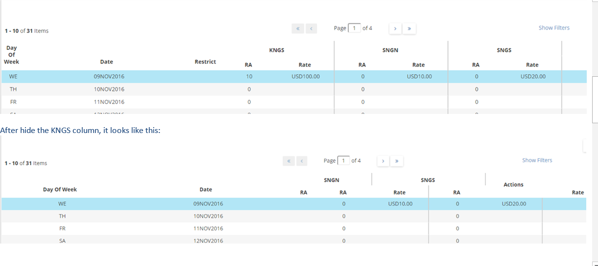 I have a grid that has subHeaders and subColumns. Ideally when I select/deselect the parent column, it should display/hide the parent columns and headers along with its subHeaders and subColumns. However it is not working fine.