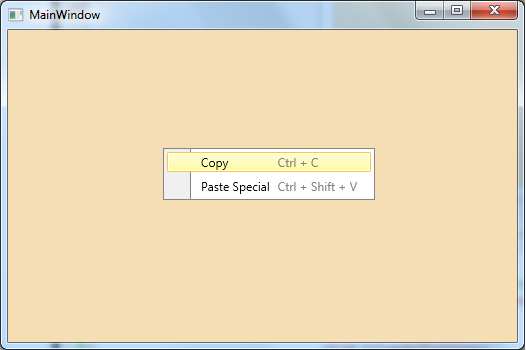 <Grid Background="Wheat"> <telerik:RadContextMenu.ContextMenu> <telerik:RadContextMenu Grid.IsSharedSizeScope="True"> <telerik:RadContextMenu.Items> <telerik:RadMenuItem HorizontalContentAlignment="Stretch"> <telerik:RadMenuItem.Header> <Grid> <Grid.ColumnDefinitions> <ColumnDefinition Width="*" /> <ColumnDefinition Width="Auto" SharedSizeGroup="AccessKey" /> </Grid.ColumnDefinitions> <TextBlock Text="Copy" /> <TextBlock Margin="8 0" Grid.Column="1" Text="Ctrl + C" Foreground="Gray" /> </Grid> </telerik:RadMenuItem.Header> </telerik:RadMenuItem> <telerik:RadMenuItem HorizontalContentAlignment="Stretch"> <telerik:RadMenuItem.Header> <Grid> <Grid.ColumnDefinitions> <ColumnDefinition Width="*" /> <ColumnDefinition Width="Auto" SharedSizeGroup="AccessKey" /> </Grid.ColumnDefinitions> <TextBlock Text="Paste Special" /> <TextBlock Margin="8 0" Grid.Column="1" Text="Ctrl + Shift + V" Foreground="Gray" /> </Grid> </telerik:RadMenuItem.Header> </telerik:RadMenuItem> </telerik:RadContextMenu.Items> </telerik:RadContextMenu> </telerik:RadContextMenu.ContextMenu></Grid>Hopefully this helps.