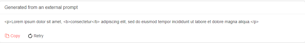 Is there any way to correctly display an HTML-formatted output using the TelerikAIPrompt control? The response I get from the API call is a Markdown string. I converted this to HTML, and all I see is text with the HTML tags printed (listed listed in the sample below).