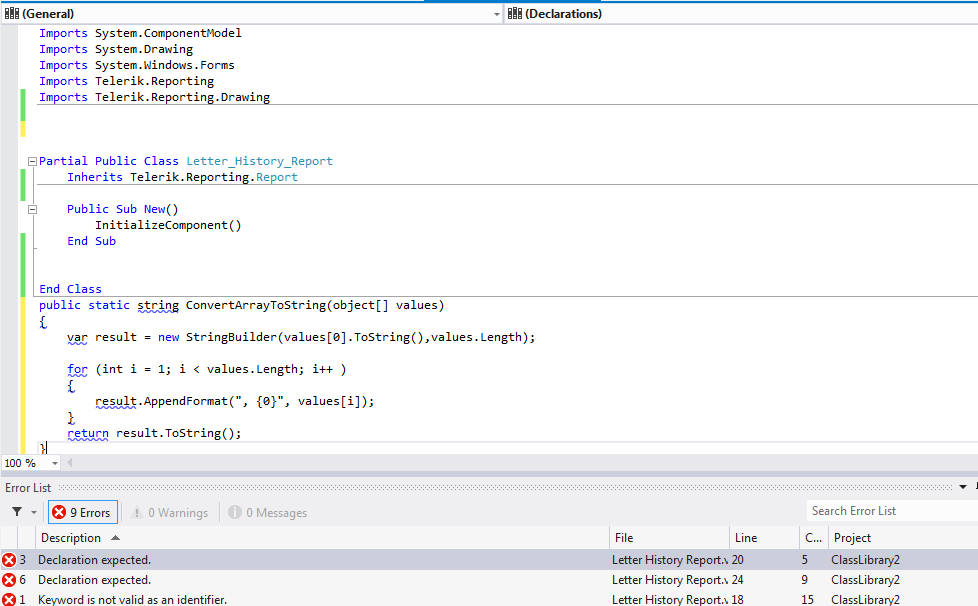 public static string ConvertArrayToString(object[] values){ var result = new StringBuilder(values[0].ToString(),values.Length); for (int i = 1; i < values.Length; i++ ) { result.AppendFormat(", {0}", values[i]); } return result.ToString();}Peter