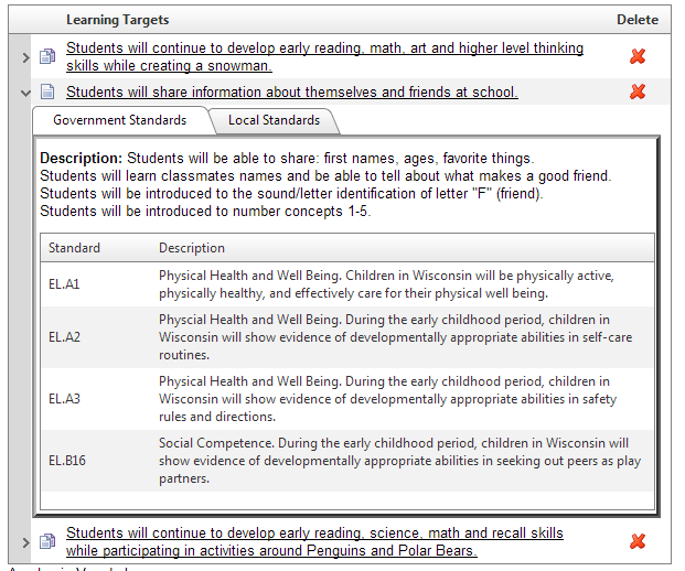 <telerik:RadGrid runat="server" ID="grdKCGs" AllowPaging="False" Width="600px" AllowMultiRowSelection="false" Visible="false" Skin="Default"> <MasterTableView DataKeyNames="KCGID" Width="600px" TableLayout="Fixed" AutoGenerateColumns="false" EnableNoRecordsTemplate="true" ShowHeadersWhenNoRecords="true"> <NoRecordsTemplate><div class="cssNoData">No items to display.</div></NoRecordsTemplate> <NestedViewTemplate> <asp:Panel runat="server" ID="InnerContainer" Visible="true"> <telerik:RadTabStrip runat="server" ID="TabStip1" MultiPageID="Multipage1" SelectedIndex="0"> <Tabs> <telerik:RadTab runat="server" Text="Government Standards" PageViewID="PageView1"> </telerik:RadTab> <telerik:RadTab runat="server" Text="Local Standards" PageViewID="PageView2"> </telerik:RadTab> </Tabs> </telerik:RadTabStrip> <telerik:RadMultiPage runat="server" ID="Multipage1" SelectedIndex="0" RenderSelectedPageOnly="false"> <telerik:RadPageView runat="server" ID="PageView1"> <table width="570px" cellpadding=3 cellspacing=0 border=0 style="border: 4px outset Silver;"> <tr> <td> <asp:Label ID="lblSwitches1" CssClass="cssContent" runat="server"></asp:Label> </td> </tr> <tr> <td> <asp:Label ID="lblExtDesc1" CssClass="cssContent" runat="server"></asp:Label> </td> </tr> <tr> <td> <asp:Label ID="lblAssessment1" CssClass="cssContent" runat="server"></asp:Label> </td> </tr> <tr> <td> <telerik:RadGrid runat="server" ID="grdGStds" AllowPaging="False" Width="100%" Height="250px" ClientSettings-Scrolling-AllowScroll="true" AllowMultiRowSelection="false" Visible="false" Skin="Default" > <MasterTableView DataKeyNames="GovtBodyStdKey" Width="100%" TableLayout="Fixed" AutoGenerateColumns="false" EnableNoRecordsTemplate="true" ShowHeadersWhenNoRecords="true"> <NoRecordsTemplate><div class="cssNoData">No items to display.</div></NoRecordsTemplate> <Columns> <telerik:GridBoundColumn HeaderStyle-Width="100px" UniqueName="GovtBodyStdKey" HeaderText="Standard" Visible="True" DataField="GovtBodyStdKey" ReadOnly="true"></telerik:GridBoundColumn> <telerik:GridBoundColumn UniqueName="GovtBodyStdDescription" HeaderText="Description" Visible="True" DataField="GovtBodyStdDescription" ReadOnly="true"></telerik:GridBoundColumn> </Columns> </MasterTableView> <ClientSettings AllowRowsDragDrop="false" > <Selecting AllowRowSelect="false" EnableDragToSelectrows="false" /> </ClientSettings> </telerik:RadGrid> </td> </tr> </table> </telerik:RadPageView> <telerik:RadPageView runat="server" ID="PageView2"> <table width="570px" cellpadding=3 cellspacing=0 border=0 style="border: 4px outset Silver;"> <tr> <td> <asp:Label ID="lblSwitches2" CssClass="cssContent" runat="server"></asp:Label> </td> </tr> <tr> <td> <asp:Label ID="lblExtDesc2" CssClass="cssContent" runat="server"></asp:Label> </td> </tr> <tr> <td> <asp:Label ID="lblAssessment2" CssClass="cssContent" runat="server"></asp:Label> </td> </tr> <tr> <td> <telerik:RadGrid runat="server" ID="grdLStds" AllowPaging="False" Width="100%" Height="250px" ClientSettings-Scrolling-AllowScroll="true" AllowMultiRowSelection="false" Visible="false" Skin="Default" > <MasterTableView DataKeyNames="STANDARDNUMBER" Width="100%" TableLayout="Fixed" AutoGenerateColumns="false" EnableNoRecordsTemplate="true" ShowHeadersWhenNoRecords="true"> <NoRecordsTemplate><div class="cssNoData">No items to display.</div></NoRecordsTemplate> <Columns> <telerik:GridBoundColumn HeaderStyle-Width="100px" UniqueName="STANDARDNUMBER" HeaderText="Standard" Visible="True" DataField="STANDARDNUMBER" ReadOnly="true"></telerik:GridBoundColumn> <telerik:GridBoundColumn UniqueName="LocalStandardDescription" HeaderText="Description" Visible="True" DataField="LocalStandardDescription" ReadOnly="true"></telerik:GridBoundColumn> </Columns> </MasterTableView> <ClientSettings AllowRowsDragDrop="false" > <Selecting AllowRowSelect="false" EnableDragToSelectrows="false" /> </ClientSettings> </telerik:RadGrid> </td> </tr> </table> </telerik:RadPageView> </telerik:RadMultiPage> </asp:Panel> </NestedViewTemplate> <Columns> <telerik:GridBoundColumn UniqueName="TopicKCGID" Visible="False" DataField="TopicKCGID" ReadOnly="true"></telerik:GridBoundColumn> <telerik:GridBoundColumn UniqueName="KCGID" Visible="False" DataField="KCGID"></telerik:GridBoundColumn> <telerik:GridImageColumn ImageAlign="Middle" ImageUrl="../images/notshared.gif" AlternateText="This item is used once in the course(Not Shared)." UniqueName="imgShared" HeaderStyle-Width="25px"></telerik:GridImageColumn> <telerik:GridTemplateColumn UniqueName="Concept" HeaderStyle-Font-Bold="true" HeaderStyle-Width="490px"> <ItemStyle VerticalAlign="Top"></ItemStyle> <ItemTemplate> <asp:LinkButton id="LinkButton1" Runat="server" CommandName="e"> <telerik:RadCodeBlock ID="cb1" runat="server"> <%# Container.DataItem("KCGDescription")%> </telerik:RadCodeBlock> </asp:LinkButton> </ItemTemplate> </telerik:GridTemplateColumn> <telerik:GridButtonColumn ShowInEditForm="false" HeaderText="Delete" ConfirmText="Are you sure you want to delete this item?" ConfirmDialogType="Classic" ConfirmTitle="Confirm Delete" HeaderStyle-width="60px" HeaderStyle-Font-Bold="true" CommandName="d" FooterText="" HeaderStyle-HorizontalAlign="Center" ItemStyle-HorizontalAlign="Center" ButtonType="ImageButton" ImageUrl="../Images/delete.gif"> </telerik:GridButtonColumn> </Columns> </MasterTableView> <ClientSettings AllowRowsDragDrop="true" > <Selecting AllowRowSelect="true" EnableDragToSelectrows="false" /> </ClientSettings> </telerik:RadGrid>