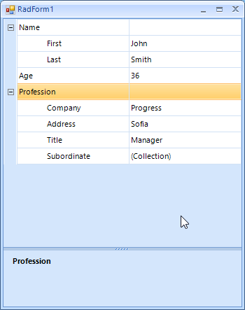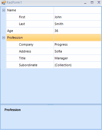 01.public class Person02. {03. [CategoryAttribute("Personal Info.")]04. public Name Name { get; set; }05. [CategoryAttribute("Personal Info.")]06. public int Age { get; set; }07. [CategoryAttribute("Profession Info.")]08. public Profession Profession { get; set; }09. }10. 11. public class Profession12. {13. private Title title_;14. 15. public string Company { get; set; }16. public string Address { get; set; }17. public Title Title18. {19. get { return title_; }20. set21. {22. title_ = value;23. if (title_ == Title.Manager)24. {25.// hide property subordinates26. }27. else if (title_ == Title.Developer)28. {29.// show property subordinates30. }31. }32. }33. 34. public List<Person> Subordinate { get; set; }35. }