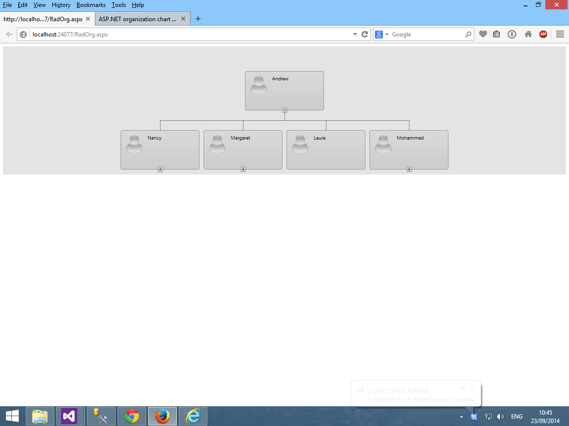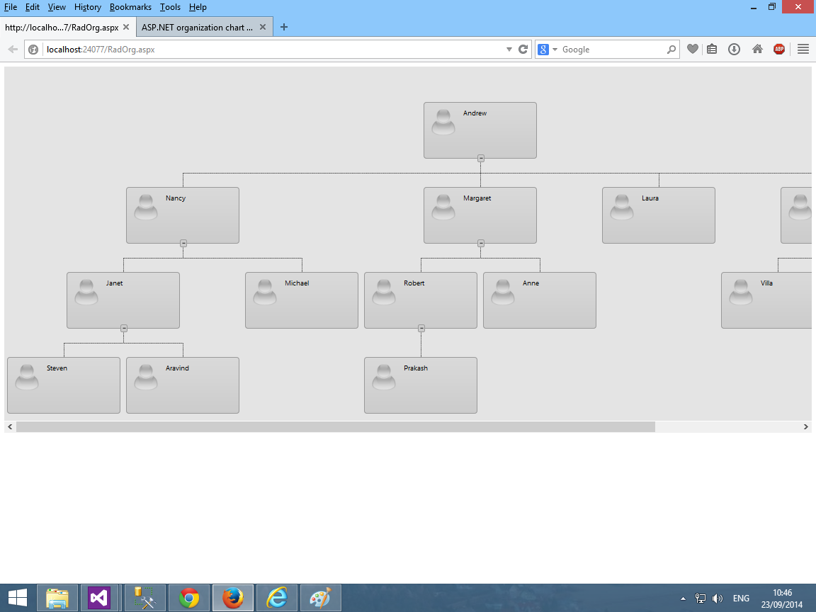 <head runat="server"> <title></title> <style type="text/css"> .orgChartDiv { background-color: #e4e4e4; height: 100%; width: 100%; overflow-y: auto; float: left; position: relative; } </style></head><body> <form id="form1" runat="server"> <div> <telerik:RadScriptManager runat="server" ID="RadScriptManager1" /> <div class="orgChartDiv"> <telerik:RadOrgChart ID="employeeOrgChart" runat="server" Skin="Default" EnableCollapsing="true" Width="100%" DataSourceID="LinqDataSource_Employee" DataTextField="FirstName" DataFieldID="EmployeeID" DataFieldParentID="ReportsTo" EnableGroupCollapsing="true" > </telerik:RadOrgChart> </div> </div> </form> <asp:LinqDataSource runat="server" ID="LinqDataSource_Employee" ContextTypeName="RadOrgChart.RealDataDataContext" TableName="Employees" /></body>With Regards,