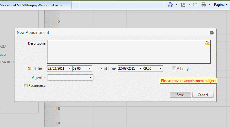e.Cancel = true; } }<telerik:RadScheduler runat="server" ID="RadScheduler1" DataKeyField="ID" DataSubjectField="Subject" DataStartField="Start" DataEndField="End" DayStartTime="07:00:00" DayEndTime="20:00:00" TimeZoneOffset="03:00:00" OnAppointmentInsert="RadScheduler1_AppointmentInsert" OnAppointmentUpdate="RadScheduler1_AppointmentUpdate" OnAppointmentDelete="RadScheduler1_AppointmentDelete" DataRecurrenceField="RecurrenceRule" DataRecurrenceParentKeyField="RecurrenceParentId" Height="100%" onappointmentdatabound="RadScheduler1_AppointmentDataBound" ondatabound="RadScheduler1_DataBound" Culture="Italian (Italy)" EditFormTimeFormat="HH.mm" FirstDayOfWeek="Monday" HoursPanelTimeFormat="HH" SelectedView="WeekView" StartInsertingInAdvancedForm="True" onformcreating="RadScheduler1_FormCreating"> <DayView DayEndTime="20:00:00" DayStartTime="07:00:00" WorkDayEndTime="20:00:00" WorkDayStartTime="07:00:00" /> <AdvancedForm Modal="true" TimeFormat="HH.mm" /> <TimelineView UserSelectable="false" /> <WeekView DayEndTime="20:00:00" DayStartTime="07:00:00" WorkDayEndTime="07:00:00" WorkDayStartTime="20:00:00" /> <TimeSlotContextMenuSettings EnableDefault="true" /> <AppointmentContextMenuSettings EnableDefault="true" /> </telerik:RadScheduler>