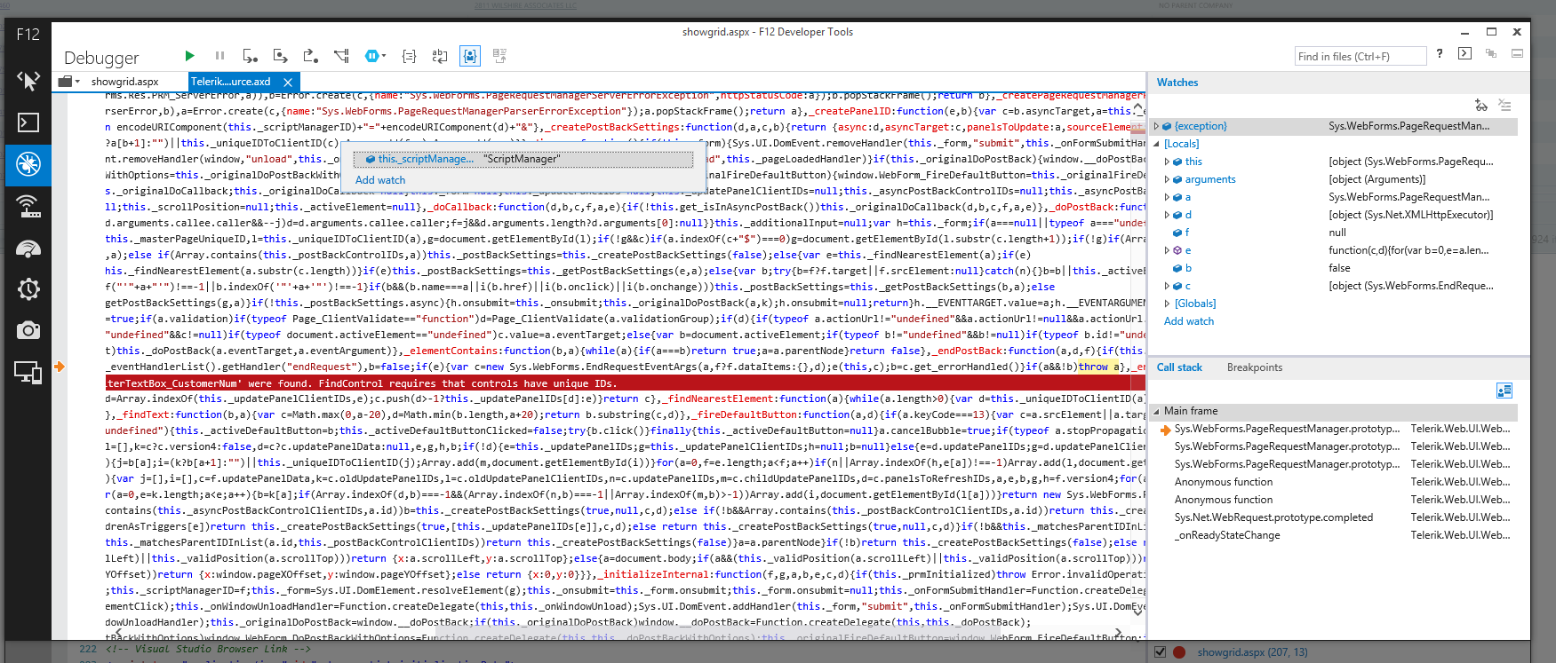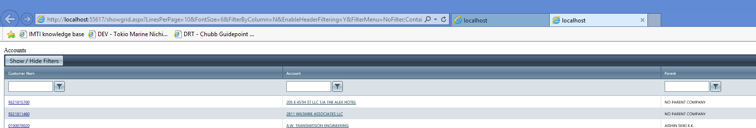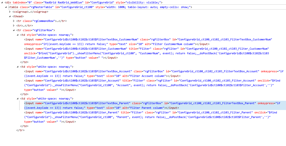 You can see the rendered grid in the attached Grid.png and the error I am getting in the Telerik.Web.UI.WebResource.axd. It looks like a problem with creating multiple filter items. Error description - "description "Sys.WebForms.PageRequestManagerServerErrorException: Multiple controls with the same ID 'FilterTextBox_CustomerNum' were found. FindControl requires that controls have unique IDs.""