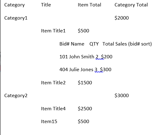 Hi all. I am trying to create a crosstab report that groups categories and titles, while showing details of purchases within those titles by clients. I am looking to building something similar to what is shown in the "What I Need" image. What I have come up with so far is shown in the "What I have" image.