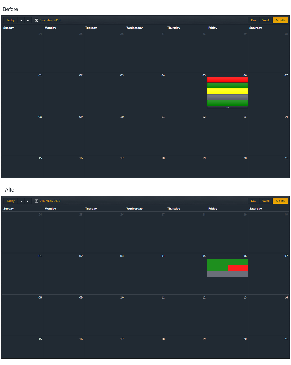 I would like to be able to display events that occur simultaneously side-by-side in the month view. For example, if I have two events that occur from 9AM - 10 AM, they both show up in 2 columns inside of the current stacked model.