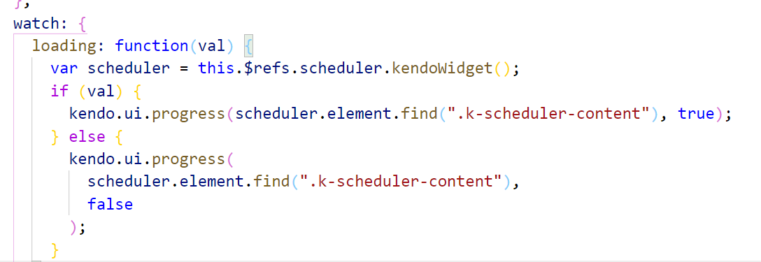 <kendo-schedulerdatasource ref="remoteDataSource" ... @requestStart="onRequestStart" @requestEnd="onRequestEnd"></kendo-schedulerdatasource>new Vue({ el: "#vueapp", methods: { onRequestStart: function(e) { var scheduler = this.$refs.scheduler.kendoWidget(); if (e.type == "update") { window.kendo.ui.progress(scheduler.element.find(".k-scheduler-content"), true); } }, onRequestEnd: function(e) { var scheduler = this.$refs.scheduler.kendoWidget(); if (e.type == "update") { window.kendo.ui.progress(scheduler.element.find(".k-scheduler-content"), false); } } }})Regards,