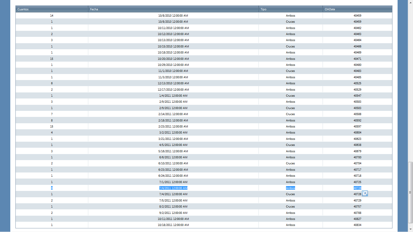 //OADate column for chart: DataColumn col = new DataColumn("OADate", typeof(System.Double)); dtable.Columns.Add(col);//Converting SQL Datetime values to OADate column int b = 0; foreach (DataRow row in dtMerArrCru.Rows) { row["OADate"] = Convert.ToDateTime(dtable.Rows[b][1]).ToOADate(); b++; }//Formatting chart: RadChart1.PlotArea.XAxis.Appearance.ValueFormat = Telerik.Charting.Styles.ChartValueFormat.ShortDate; RadChart1.PlotArea.XAxis.Appearance.CustomFormat = "MM/dd/yyyy"; RadChart1.PlotArea.XAxis.IsZeroBased = false; RadChart1.PlotArea.XAxis.AutoScale = false; RadChart1.PlotArea.XAxis.AddRange(Convert.ToDouble(dtMerArrCru.Rows[0]["OADate"]), Convert.ToDouble(dtMerArrCru.Rows[dtMerArrCru.Rows.Count - 1]["OADate"]), 1); RadChart1.DataGroupColumn = "Type"; RadChart1.DataManager.ValuesXColumn = "OADate"; RadChart1.DataManager.ValuesYColumns = new string[] { "Quantity" }; RadChart1.DataSource = dtable; RadChart1.DataBind();