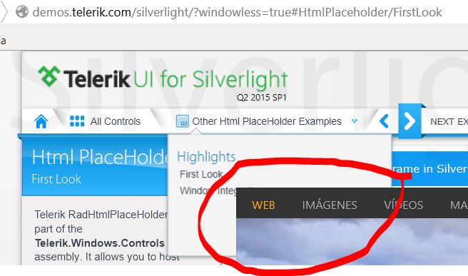 Please accept my apology for not making myself clear with my previous post. Basically, you are not allowed to visualize any HTML content inside the Silverlight plug in. This is why we designed the RadHtmlPlaceholder control to be visualized on top of the Silverlight plugin. Hence everything hosted inside the plug in will be hidden under the RadHtmlPlaceholder control. This behavior is by design.