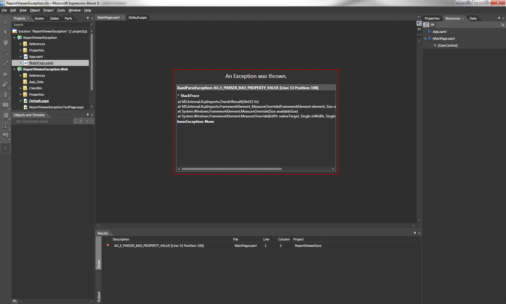 We hit this when trying to just place the viewer in a control to just workout how we'd like it placed on the page (didn't set any properties; just trying to style things). We are getting the "AG_E_UNKNOWN_ERROR" error (XAML Parse Exception)