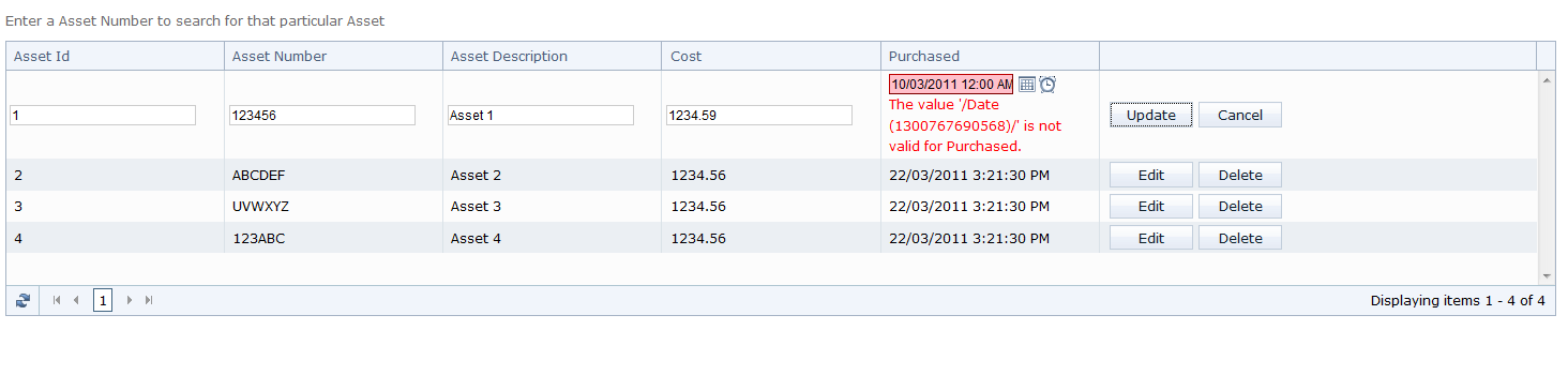Just looking at using some of the MVC Telerik controls, particularly the grid, so just starting out with a simple Grid, following the samples, all is good, with a String, Number field, with ajax editing inline, just have a simple class that is returning me a list of objects. So stops working when I add a DateTIme field into the Object class.