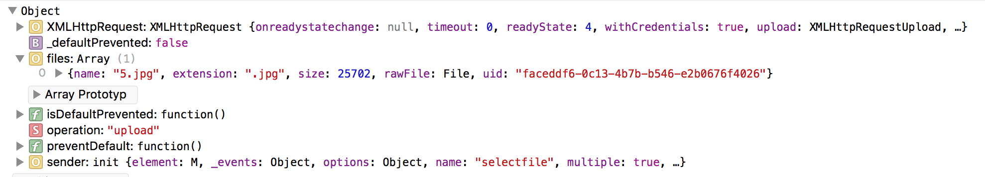 It always runs into the error event showing me that all is fine (console.log(e); -> see attachment e_output). Beside of that kendo.all.js (line 2096) gives this output in into the console: