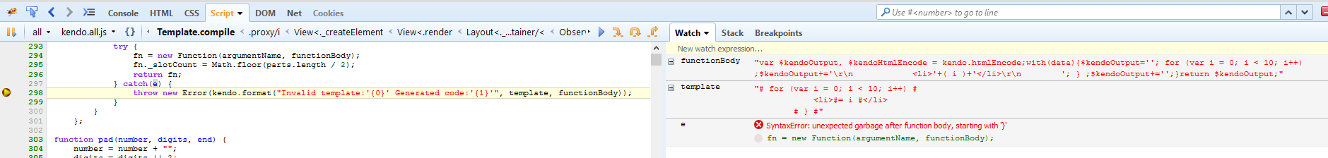 The picture says it all. I took a screenshot of the debugger so you can see the source template value, the resulting calculated JS, and the exception being thrown. This makes no sense to me. It's a very simple for loop. It's taken almost exactly from the examples in the documentation. I have spent over an hour trying various adjustments and this seems like a bug. What's going on?