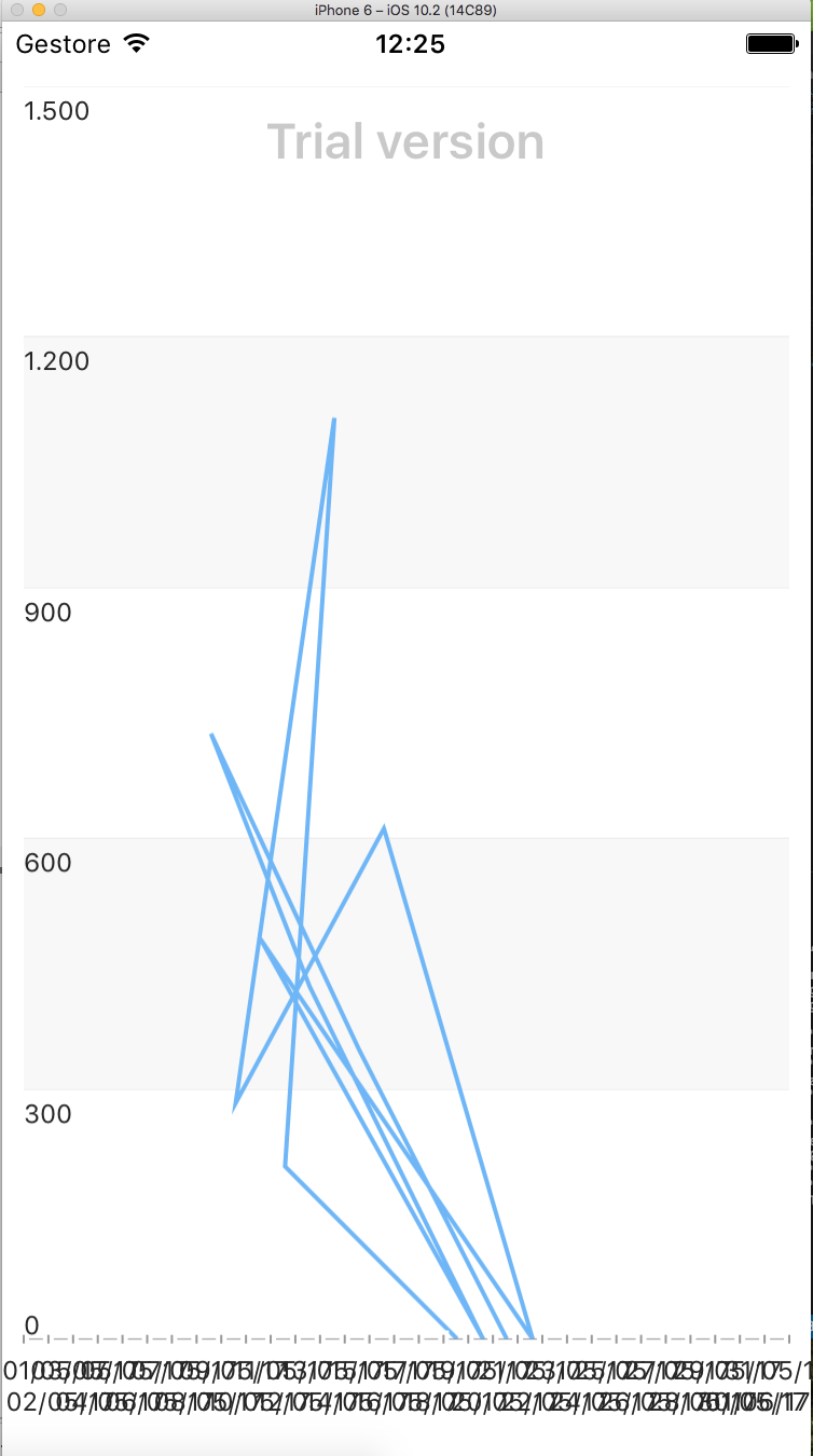 [{"date":"2017-05-18","amount":0,"label":"05-18","timestamp":1495065600000},{"date":"2017-05-11","amount":206.7,"label":"05-11","timestamp":1494460800000},{"date":"2017-05-13","amount":1102.3,"label":"05-13","timestamp":1494633600000},{"date":"2017-05-09","amount":282.6,"label":"05-09","timestamp":1494288000000},{"date":"2017-05-15","amount":610.8,"label":"05-15","timestamp":1494806400000},{"date":"2017-05-21","amount":0,"label":"05-21","timestamp":1495324800000},{"date":"2017-05-10","amount":478.9,"label":"05-10","timestamp":1494374400000},{"date":"2017-05-19","amount":0,"label":"05-19","timestamp":1495152000000},{"date":"2017-05-12","amount":421.6,"label":"05-12","timestamp":1494547200000},{"date":"2017-05-08","amount":724.5,"label":"05-08","timestamp":1494201600000},{"date":"2017-05-14","amount":346.2,"label":"05-14","timestamp":1494720000000},{"date":"2017-05-20","amount":0,"label":"05-20","timestamp":1495238400000}]With that data I can show the graph on iOS simulator with the following description
