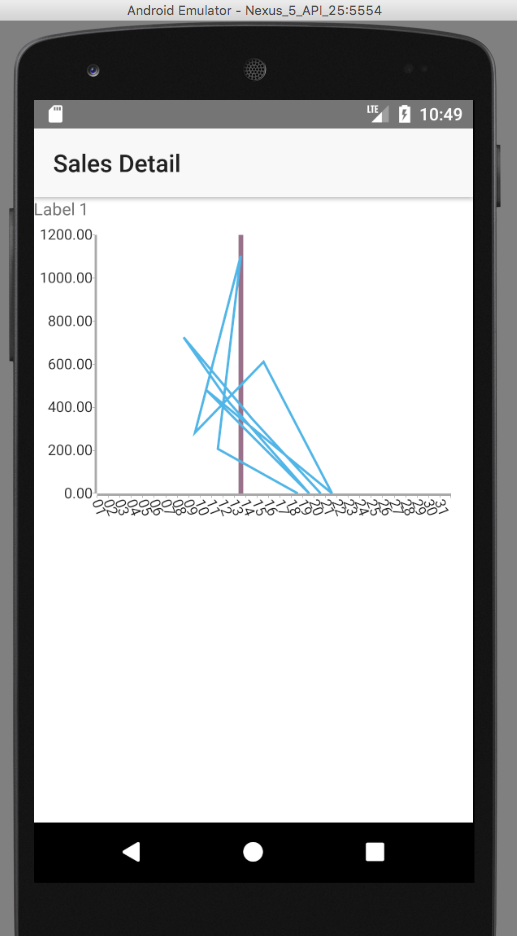 <RadCartesianChart id="chartid" height="250" row="0" tkExampleTitle tkToggleNavButton> <LinearAxis tkCartesianVerticalAxis></LinearAxis> <DateTimeContinuousAxis #myDateTimeContinuousAxis tkCartesianHorizontalAxis id="hAxis" [minimum]="minimum" [maximum]="maximum" [majorStep]="majorStep" [dateFormat]="dateFormat" labelFitMode="Rotate" labelRotationAngle="0.9"></DateTimeContinuousAxis> <LineSeries tkCartesianSeries [items]="categoricalSource" categoryProperty="timestamp" valueProperty="amount"></LineSeries> <ChartGridLineAnnotation tkCartesianAnnotations axisId="hAxis" hidden="false" zPosition="BelowSeries" strokeWidth="4" value="1494633600000" strokeColor="#EB916580"> </ChartGridLineAnnotation> </RadCartesianChart>TypeScript