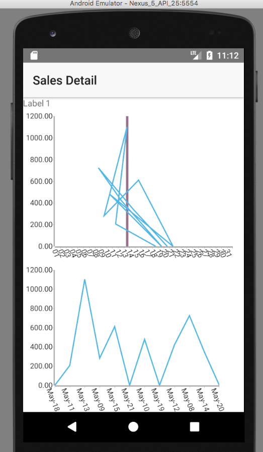 <GridLayout rows="auto,auto"><br><RadCartesianChart height="250" row="0" tkExampleTitle tkToggleNavButton><br> <LinearAxis tkCartesianVerticalAxis></LinearAxis><br> <!--<br> <DateTimeCategoricalAxis tkCartesianHorizontalAxis></DateTimeCategoricalAxis><br> <LineSeries tkCartesianSeries [items]="categoricalSource" categoryProperty="date" valueProperty="amount"></LineSeries><br> --><br> <DateTimeContinuousAxis tkCartesianHorizontalAxis id="hAxis" minimum="01/05/2017" maximum="31/05/2017" majorStep="Day" dateFormat="dd" labelFitMode="Rotate" labelRotationAngle="1.2"></DateTimeContinuousAxis><br> <LineSeries tkCartesianSeries [items]="categoricalSource" categoryProperty="timestamp" valueProperty="amount"></LineSeries><br> <ChartGridLineAnnotation tkCartesianAnnotations axisId="hAxis" hidden="false" <br> zPosition="BelowSeries" strokeWidth="4" value="1494633600000"<br> strokeColor="#EB916580"><br> </ChartGridLineAnnotation><br><br></RadCartesianChart><br><RadCartesianChart height="250" row="1" tkExampleTitle tkToggleNavButton><br> <LinearAxis tkCartesianVerticalAxis></LinearAxis><br> <DateTimeCategoricalAxis tkCartesianHorizontalAxis dateFormat="MMM-dd" labelFitMode="Rotate" labelRotationAngle="1.2"></DateTimeCategoricalAxis><br> <LineSeries tkCartesianSeries [items]="categoricalSource" categoryProperty="date" valueProperty="amount"></LineSeries><br> <!--<br> <DateTimeContinuousAxis tkCartesianHorizontalAxis id="hAxis" minimum="01/05/2017" maximum="31/05/2017" majorStep="Day" dateFormat="dd" labelFitMode="Rotate" labelRotationAngle="1.2"></DateTimeContinuousAxis<br> <LineSeries tkCartesianSeries [items]="categoricalSource" categoryProperty="timestamp" valueProperty="amount"></LineSeries><br> <ChartGridLineAnnotation tkCartesianAnnotations axisId="hAxis" hidden="false" <br> zPosition="BelowSeries" strokeWidth="4" value="1494633600000"<br> strokeColor="#EB916580"><br> </ChartGridLineAnnotation><br> --><br><br></RadCartesianChart><br></GridLayout>Thanks for writing back. Happy to hear that the problem with the annotation is now resolved.
