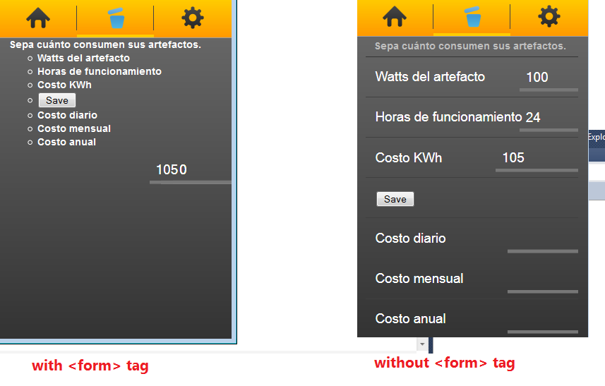 <div data-role="view" id="forms" data-title="Calculadora de Consumo" data-layout="layout" data-transition="slide" data-init="initForm" > <ul data-role="listview" data-style="inset" data-type="group"> <li> Sepa cuánto consumen sus artefactos. <ul> <li> <input type="tel" name="watts" size="5" value="0" />Watts del artefacto </li> <li> <input type="tel" name="hours" size="5" value="0" />Horas de funcionamiento </li> <li> <input type="tel" name="unitcost" size="9" value="105" />Costo KWh </li> <li> <input type="button" value="Calculate" onclick="workitout(this.form)" /> </li> <li> <input type="text" name="daycost" size="7" />Costo diario </li> <li> <input type="text" name="qtrcost" size="7" />Costo mensual </li> <li> <input type="text" name="yrcost" size="7" />Costo anual </li> </ul> </li> </ul></div><script language="JavaScript" type="text/JavaScript"><!--function workitout(form){var kw = form.watts.value / 1000;var hrs = parseInt(form.hours.value);var cost = (form.unitcost.value * kw * hrs) / 100;var annual = cost * 365;var quarter = annual / 12; cost = round(cost);annual = round(annual);annual = round(annual);form.daycost.value = cost;form.qtrcost.value = quarter;form.yrcost.value = annual;}function round (num) {num = Math.round(num * 100) / 100;num = (num + 0.001) + '';return num.substring(0, num.indexOf('.') + 3);} // End --></script>